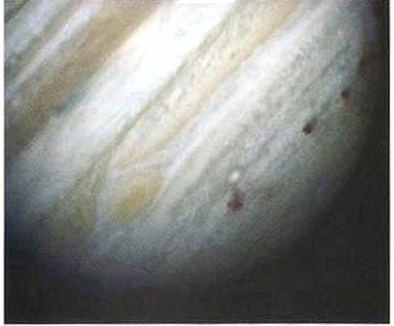 Рис. 9. В 1994 году комета Шумейкеров-Леви-9 раздробилась на 20 частей еще до того. как врезаться в Юпитер. На изображении, полученном космическим телескопом «Хаббл», видны темные пятна в тех местах, где четыре куска кометы влетели в атмосферу. Подобные падения на Землю могли изменить условия жизни в эпоху молодости пашей планеты, а сейчас они могли бы угрожать жизни на ней. С разрешения HST Comet Team & NASA.