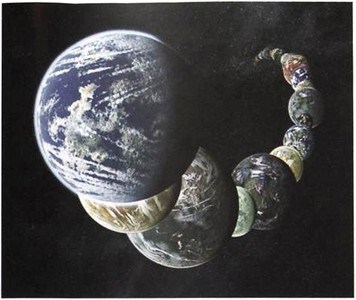 Рис. 16. Представление художника о множестве планет типа Земли, ожидаемых в нашей Галактике. Каждая из них имеет свою особую структуру поверхности, воду и атмосферу. Трудный вопрос для астробиологии: какая доля из этих планет обладает хоть какой-нибудь жизнью? С разрешения NASA.