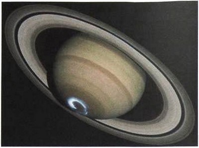 Рис. 11. Полярное сияние в районе южного полюса Сатурна ясно видно на комбинированном ультрафиолетовом и визуальном изображении, полученном космическим телескопом «Хаббл» и 2004 году. С разрешения NASA, ESA, J. Clarke (Boston University) & Z. Levay (STScI).