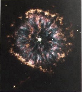 Рис. 14. Эта великолепная планетарная туманности (NGC 6751) в созвездии Орел представляет собой газовую оболочку, сброшенную тысячи лет назад горячей звездой, которая видна в центре. Появление такой туманности говорит о скорой смерти звезды типа Солнца. Хотя туманность «планетарная», она не имеет ничего общего с планетами. Диаметр этой туманности около 1 светового года, в 700 раз больше размера Солнечной системы. С разрешения NASA. The Hubble Heritage Team STScl/AURA.