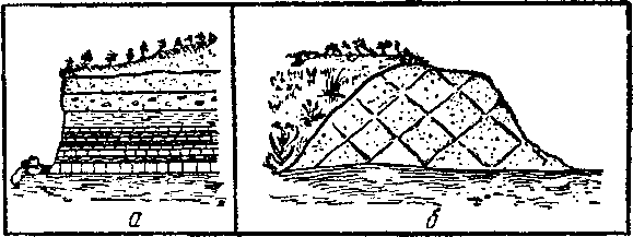Рис. 3. Два вида горных пород: а — выход слоистой горной породы, состоящей из пластов разной толщины и разных цветов; б — выход массивной горной породы, разбитой трещинами на угловатые глыбы.
