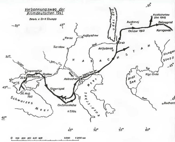 Маршрут депортаций крымских немцев е 1941 году. С августа по октябрь товарные составы везли людей по маршруту: Симферополь — Орджоникидзе — Астрахань — Орск — Караганда