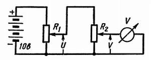 Н. — Я полностью согласен, что в этом случае вольтметр правильно покажет выходное напряжение потенциометра R2. Но я очень боюсь, как бы это сопротивление 10 000 ом, подключенное к потенциометру R1, не повлияло сильно на потенциал последнего.