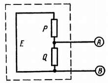 Л. — Такую реакцию я и предвидел. Резистор Q включен параллельно с тем, что ты можешь включить между точками А и В. Если его сопротивление мало по сравнению с Р, то мы можем разместить между А и В резистор с сопротивлением, малым по сравнению с Р, но большим по сравнению с Q. Следовательно, величина Q останется неизменной, иначе говоря, внутреннее сопротивление нашего эквивалентного источника имеет величину, значительно меньшую Р.