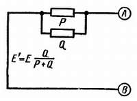 Рис. 150. Напряжение между точками А и В схемы рис. 149 эквивалентно (по преобразованию Тевенина) напряжению источника э. д. с. Е', внутреннее сопротивление которого представляет собой параллельно соединенные резисторы Р и Q (оно равно P·Q/(P + Q)).