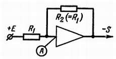 Рис. 151. Из-за глубокой отрицательной обратной связи коэффициент передачи усилителя становится равным — 1 (при этом следует считать, что напряжение в точке А почти равно нулю и что входной ток усилителя тоже ничтожно мал).