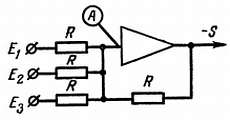 Токи, протекающие по трем расположенным слева резисторам, соответственно равны E1/R, E2/R и E3/R. Ток, протекающий по расположенному справа резистору, равен, как мы только что установили, S/R. Потенциал точки А из-за очень высокого коэффициента усиления усилителя следует, как и раньше, считать равным нулю. Из-за высокого входного сопротивления поступающий на вход усилителя ток следует также рассматривать как равный нулю. Это означает, что сумма трех поступающих в точку А токов должна быть равна выходному току. Если при написании этого равенства из всех его членов убрать знаменатель R, то мы получим Е1 + Е2 + Е3 = S. Таким образом, мы получили напряжение, равное сумме трех напряжений.