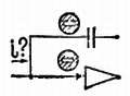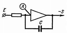 Н. — На вид она очень простая, но я не доверяю кажущейся простоте. Я полагаю, что, продолжая наши недавние рассуждения, можно считать потенциал точки А практически равным нулю. В этих условиях протекающий по резистору ток должен быть равен E/R. Однако это совершенно не соответствует действительности, так как ток не может идти на вход усилителя (входное сопротивление бесконечно велико). Ток должен идти через конденсатор, однако постоянный ток через конденсатор протекать не может.