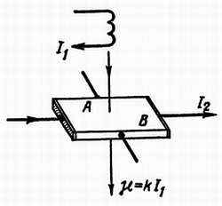 Ток протекает по пластине направо, а магнитное поле Н направлено сверху вниз. В этих условиях между точками А и В появляется разность потенциалов, которая пропорциональна протекающему по пластине току и напряженности магнитного поля. Если магнитное поле создается катушкой, по которой протекает ток I1, а по пластине проходит ток I2, то разность потенциалов между точками А и В пропорциональна произведению I1I2. Таким образом можно создать аналоговый умножитель.