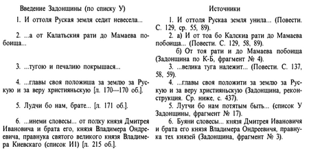 3. Текстологической связи Слова с редакциями, видами и списками Задонщины с тем, чтобы определить, чем объясняются совпадения отдельных чтений Слова с различными текстами Задонщины. В самом деле, если будет доказано, что Слово текстологически связано только с Пространной редакцией Задонщины, а последняя восходит к Краткой и не имеет никаких других источников, которые могли быть отождествлены непосредственно (или опосредованно) со Словом, то Песнь о походе Игоря придется признать произведением вторичным, а Задонщину Пространной редакции первичной.