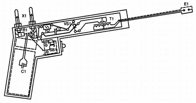Конструкция электрозажигалки-пистолета с расположением элементов схемы показана на рис. 23.