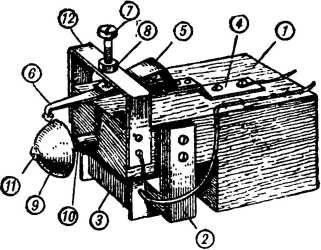 Рис. 44. Самодельный электрозвонок и его части: 1 — деревянное основание; 2 — электромагнит; 3 — катушка электромагнита; 4 — якорь; 5 — контактная пластинка; 6 — молоточек; 7 — контактный регулировочный винт; 8 — контргайка; 9 — чашечка; 10 — стоечка; 11 — крепежный шуруп; 12 — контактная скоба.