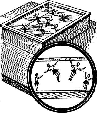 Небольшую коробку из-под печенья оклейте внутри оловянной или алюминиевой бумагой (фольгой), в которую завертывают шоколад. Из кусочков соломы или из сердцевины бузины сделайте человеческие фигурки. Для этих фигурок можно склеить костюмчики из папиросной бумаги. Фигурки должны быть очень легкими. Положите фигурки на дно коробки. Сверху коробку закройте стеклом и приклейте его к стенкам бумажными полосками (рис. 55).