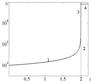 Как видно из рисунка, развитие в режиме с обострением можно условно разделить на три стадии: квазистационарную стадию -1, или стадию медленного роста, когда прирост функции заметен только на очень больших промежутках времени; стадию быстрого роста – 2, и стадию взрывного развития – 3. То есть развитие в таком режиме идет с ускорением, длится конечное время и всегда заканчивается взрывом, коллапсом вблизи точки сингулярности. В реальности вблизи момента обострения система переживает сильнейший кризис, сопровождающийся качественными изменениями, и начинается новый цикл развития обновленной системы.