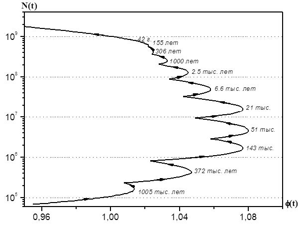 За основу бралась периодизация С. П. Капицы, включающая в себя 11 исторических эпох. Продолжительность каждого витка траектории в модели согласуется с длительностью основных исторических эпох[438] и общей численностью людей на каждом этапе.