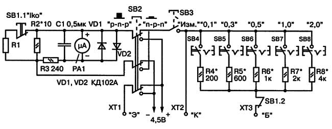 Для измерения коэффициента передачи тока при подключении всех выводов транзистора нажимают одну из кнопок SB4-SB8, задавая ток базы, и кнопку SB3. При этом показания стрелочного прибора (шкала -100 делений) нужно умножить на коэффициент, показанный над кнопкой заданного тока базы.