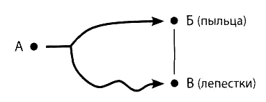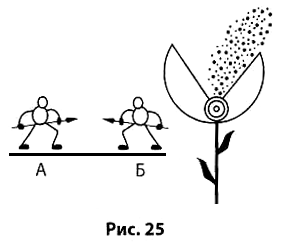 б) по правилу 4 надо ввести частицы Б, которые, не мешая частицам А переносить пыльцу, будут мешать им соединять лепестки (рис. 25). Частицы Б должны находиться у лепестков и не должны занимать остальное пространство, чтобы не мешать переносу пыльцы.