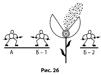 Частицы А создаются воздуходувкой. А откуда возьмутся частицы Б? Взять их можно из ВПР, т. е. из воздуха, но откуда возникнет сила, необходимая для рассоединения лепестков? По правилу 6 следует разделить частицы Б на Б-1 и Б-2 и получить рассоединяющую силу за счет взаимодействия Б-1 и Б-2. Очевидно, что для этого частицы Б-1 и Б-2 должны быть заряжены одноименно (рис. 26).