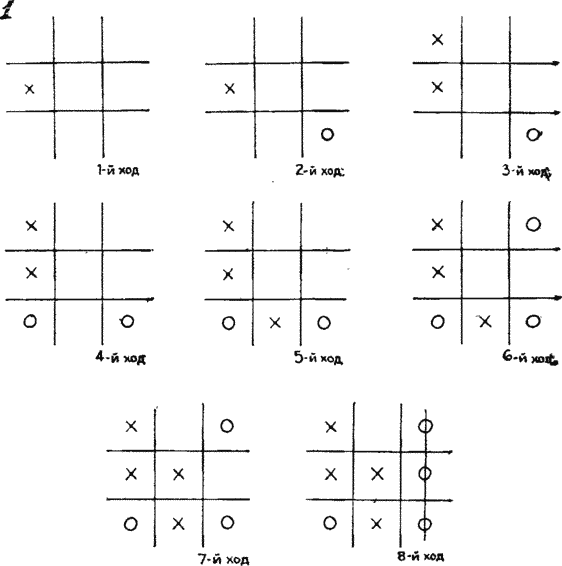 Чтобы разобраться, как действует мистер Ярмар, рассмотрим подробно партию, изображенную на картинках. Ходы приведены на диаграммах, показанных на рис. 1. Даже если мистер Ярмар ходит вторым (ставит нолики), то на шестом ходу он может поставить даме западню, которая обеспечит ему выигрыш на восьмом ходу независимо от того, как именно пойдет дама на седьмом ходу. Всякий, кто умеет играть на гроссмейстерском уровне в «крестики-нолики», взяв на вооружение магический квадрат, станет непобедимым игроком в 15.