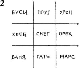 Двое игроков по очереди вычеркивают по одному слову, помечая каждый сделанный ход своими инициалами или условным значком. Выигрывает тот, кому первым удастся вычеркнуть три слова, имеющие общую букву. Пройдет немало времени, прежде чем игроки поймут, что и на этот раз они играют в добрые старые «крестики-нолики». Изоморфизм игр нетрудно установить, если вписать слова в клетки таблички, расчерченной для игры в «крестики-нолики» (рис. 2). Как нетрудно проверить, общая буква имеется лишь у трех слов, расположенных по горизонталям, вертикалям и диагоналям. Тем самым доказано, что играть в слова означает по существу играть в «крестики-нолики», и наоборот (или в 15).