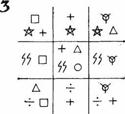 Нетрудно видеть, что любая партия в 15 эквивалентна партии а «крестики-нолики», разыгрываемой на магическом квадрате. У мистера Ярмара имеется магический квадрат, начерченный на листке бумаги, в который он тайком поглядывает. Хотя существует единственный квадрат ло-шу, но его можно повернуть четырьмя разными способами и, если угодно, подвергнуть зеркальному отражению. Любая из 8 разновидностей магического квадрата может служить тайным ключом к гроссмейстерской стратегии при игре в 15.