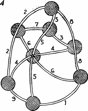 Чтобы установить изоморфизм, достаточно перенумеровать дороги так, как показано на рис. 4. Каждая дорога соответствует клетке магического квадрата, помеченной тем же числом. Каждый город на карте соответствует горизонтали, вертикали или диагонали в магическом квадрате. Как и в предыдущих случаях, изоморфизм полный. Всякий, кто умеет на гроссмейстерском уровне играть в «крестики-нолики», не будет знать горечи поражений и в новой игре.