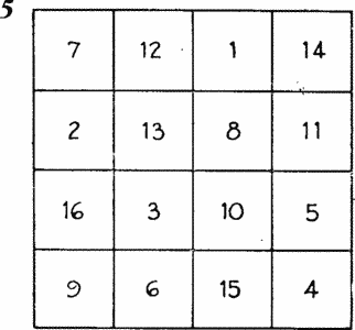 На рис. 5 изображен один из 880 различных (не переходящих друг в друга под действием поворотов и отражений) магических квадратов 4?4. Постоянная этого квадрата (сумма чисел, стоящих на любой горизонтали, вертикали и диагонали) равна 34. Может ли такой квадрат служить ключом для беспроигрышной игры в 34, то есть игры, в которой игроки по очереди выбирают число от 1 до 16 (ни одно число не разрешается выбирать дважды) до тех пор, пока у одного из игроков не наберется четыре числа, дающие в сумме 34. Изоморфна ли игра в 34 игре в «крестики-нолики» на магическом квадрате, изображенном на рис. 5? Нет, не изоморфна! Почему?