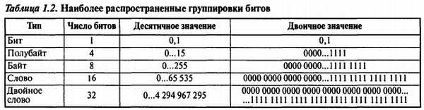 Биты любой n-разрядной двоичной последовательности могут образовывать в общей сложности 2n комбинаций. При этом большинство компьютеров хранят и обрабатывают биты группами. Например, первый микропроцессор Intel 4004 обрабатывал данные по четыре бита (полубайт) за раз. Большинство современных процессоров оперируют с 8-битными (байт), 16-битными (слово), 32-битными (двойное слово) и 64-битными (счетверенное слово) блоками. Характеристики некоторых из указанных групп перечислены в Табл. 1.2. Приведенные названия являются в какой-то мере стандартом де-факто, однако иногда встречаются и другие варианты.