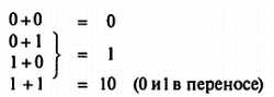 Двоичная арифметика[16] подчиняется тем же правилам, что и более привычная для вас арифметика по основанию 10. Более того, это утверждение справедливо для любой системы счисления. Простейшей арифметической операцией является операция сложения, представляющая сокращенную форму записи операции нахождения общего количества чего-либо по сравнению с более примитивным процессом счета или прибавления единицы. Так, запись 2 + 4 = 6 гораздо удобнее, чем 2 + 1 = 3, 3 + 1 = 4, 4 + 1 = 5, 5 + 1 = 6. Однако при этом необходимо помнить правила сложения. Для десятичных чисел существует 45 правил, если учесть, что порядок слагаемых не важен, — от 0 + 0 = 0 до 9 + 9 = 18. Двоичное сложение гораздо проще, поскольку подчиняется всего трем правилам: