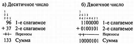Сначала эти правила применяются к самым младшим значащим битам (Least Significant Bit — LSB); при возникновении переноса он передается в бит, расположенный левее. Процесс вычисления заканчивается старшими значащими битами (Most Significant Bit — MSB). Если из этой позиции происходит перенос, то именно он становится самым старшим битом суммы. Например: