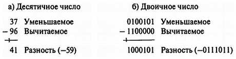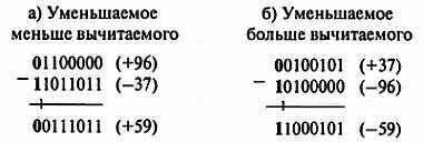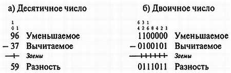 В соответствии с известной методикой вычитания десятичных чисел правила вычитания применяются и к двоичным числам, начиная с младших битов и заканчивая старшими. Для каждого бита, в котором из меньшего числа вычитается большее, из ближайшего старшего бита занимается единица. С учетом заема правила вычитания в двоичной системе имеют вид