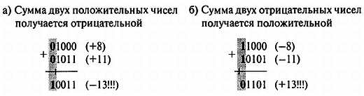 С арифметическими операциями над отрицательными числами, представленными в дополнительном коде, связаны две проблемы. Первая из этих проблем — переполнение (overflow). Она заключается в том, что при сложении двух положительных или двух отрицательных чисел может возникнуть переполнение в знаковом бите, например: