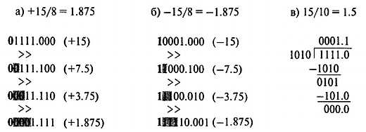 Деление на число, не являющееся степенью двойки, показано в примере (в). Эта операция осуществляется аналогично операции деления столбиком в десятичной системе. При ее выполнении по аналогии с умножением используется комбинирование операций сдвига и вычитания.