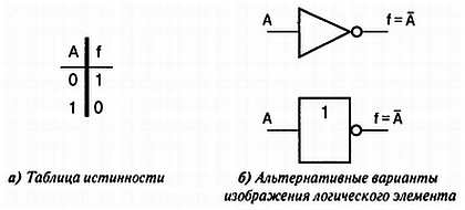 Инверсия, или операция НЕ (NOT), обозначается символом надчеркивания. Таким образом, выражение f = А¯ означает, что переменная f является обратной величиной переменной А. То есть если А = 0, то f = 1, и, наоборот, если А = 1, то f = 0. На Рис. 1.1, а эта зависимость представлена в виде таблицы истинности (truth table). По определению двойная инверсия переводит переменную в первоначальное состояние: f= = f[19].