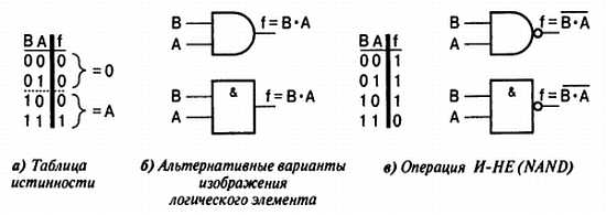 Оператор И (AND) реализует функцию «все или ничего». Результат операции будет истинным только в том случае, если все n входов истинны. На Рис. 1.2 имеется две входные переменные, и выражение для выходного значения записывается как f = В∙А, где символ «» — булевый оператор И[21]. Количество входных переменных может быть любым, и в общем случае f = А(0)∙А(1)∙А(2)∙…∙А(n). Операцию И иногда называют операцией логического умножения, поскольку (по аналогии с обычным умножением) результат этой операции между любым битом и 0 всегда будет равен 0.