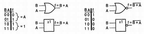 Действие оператора ИЛИ (OR) можно описать словом «что-нибудь». Результат этой операции будет истинным, если истинно хотя бы одно из входных значений (поэтому на символе изображено «>= 1»). Хотя элемент, показанный на Рис. 1.3, имеет только два входа, операция ИЛИ применима к любому числу входных переменных. Часто операцию ИЛИ называют логическим сложением, соответственно в качестве математического оператора используется знак «+»[22]:
