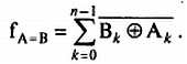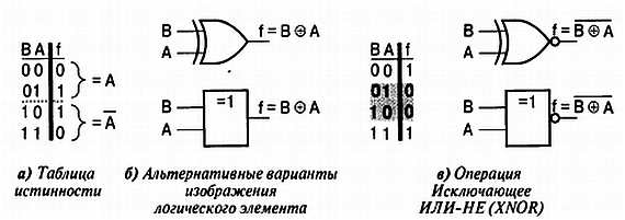 Другим полезным применением функции Исключающее ИЛИ можно назвать использование ее в качестве логического дифференциатора. Из таблицы истинности (Рис. 1.4, а) видно, что выход элемента Исключающее ИЛИ истинен только тогда, когда состояния обоих входов различны. Аналогично, из таблицы истинности оператора Исключающее ИЛИ-HE (XNOR), показанной на Рис. 1.4, в, видно, что выход такого элемента истинен при одинаковых сигналах на обоих входах. Таким образом, вентиль Исключающее ИЛИ-HE можно рассматривать в качестве 1-битного компаратора. Равенство двух «-битных значений можно проверить, объединив по И набор вентилей Исключающее ИЛИ-HE (см. Рис. 2.7 на стр. 37), каждый из которых реализует функцию