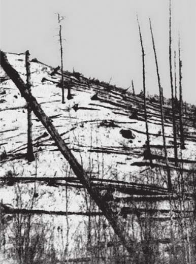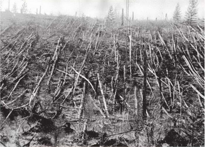 «Ошеломляющая картина открылась передо мной… Еще недавно, по заверению местных жителей, здесь синела тайга, бесконечная, могучая. Теперь вся она уничтожена, повалена на землю, лежит параллельными рядами голых, без ветвей и коры, стволов… Я не могу реально представить себе всей грандиозности картины этого исключительного падения… Не видно отсюда, с нашего наблюдательного пункта, и признаков леса: всё повалено и сожжено, а вокруг на эту мёртвую площадь надвинулась молодая, двадцатилетняя поросль… И жутко становится, когда видишь десяти-, двадцативершковых великанов, переломанных пополам, как тростник…»