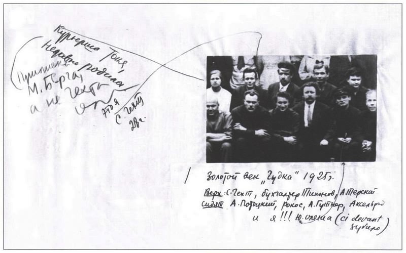4. Подписи к фотографии (рукою Ю. Олеши): Золотой век «Гудка» 1925 г. Верх: С. Гехт, бухгалтер Тихонов, А. Терской. Сидят: А. Потоцкий, Рокос, А. Гутнер, Аксельрод и я!!! Ю. Олеша (ci devant Зубило). (рукою С. Гехта): Это я С. Гехт. 28 г. (рукою М. Берга): Курьерша Тоня недавно родила, (рукою Ю. Олеши): Приписка М. Берга, а не Гехта.