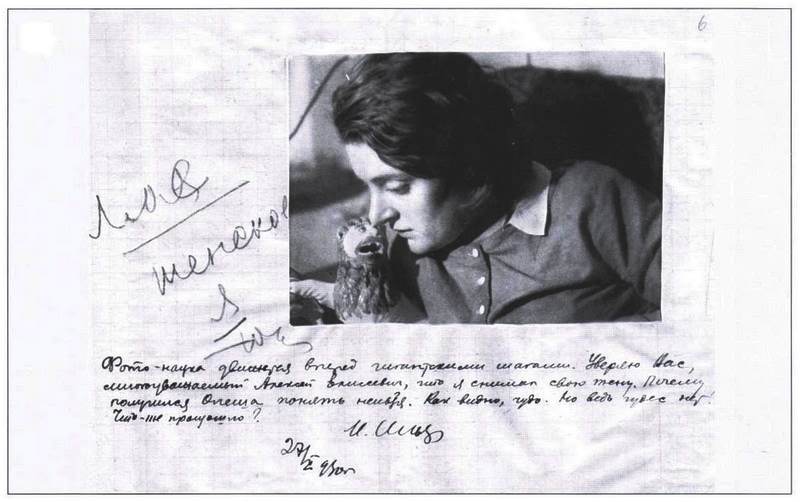 6. Мария Файнзильберг-Ильф. Подписи под фотографией (рукою Ю. Олеши): Мое женское я. (рукою И. Ильфа): Фото-наука движется вперед гигантскими шагами. Уверяю Вас, многоуважаемый Алексей Елисеевич <Крученых>, что я снимал свою жену. Почему получился Олеша понять нельзя. Как видно, чудо. Но ведь чудес нет! Что же произошло? И. Ильф. 27/V <1>930 г.