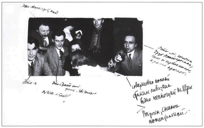 8. Подписи под фотографией слева направо (рукою В. Катаева): Это я <.> Это Аксельрод, худ<ожник> <.> Это брат мой Женя — Евг. Петров <.> В. Катаев <.> Совершенно полный стакан пива, — как видно непьющий М. Штих. Впрочем, снимок моментальный… Это М. Штих друг Пастернака, чем и известен, кроме прочего.