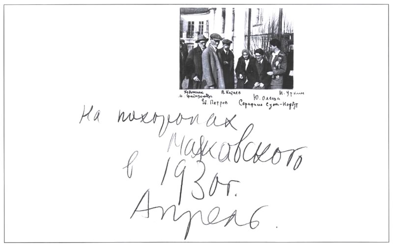 11. Подписи под фотографией слева направо (рукою А. Е. Крученых): Художник М. Файнзильберг, Евг. Петров, В. Катаев, Серафима Суок-Нарбут, Ю. Олеша, И. Уткин, (рукою Ю. Олеши): На похоронах Маяковского в 1930 г. Апрель.