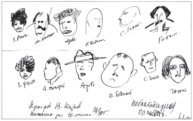 14. Портреты (слева направо): З. Райх, А. Толстого, Арго, Д. Бедного, С. Гехта и Н. Гоголя. Верхний ряд рукою В. Катаева, нижний — рукою Ю. Олеши. 1930 г. Справа внизу (рукою Ю. Олеши): Неблагодарная память.