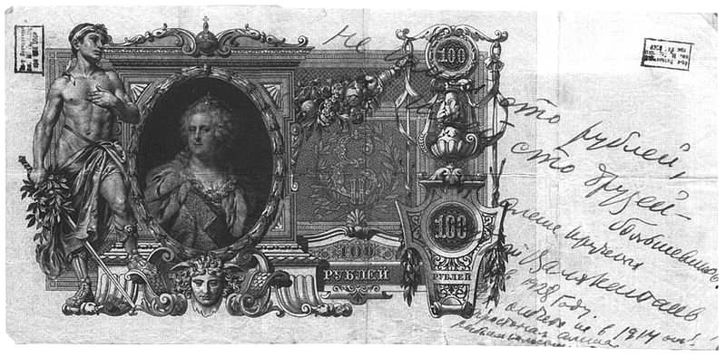 15. «Екатерининка». Сторублевая купюра, подаренная Валентином Катаевым Алексею Крученых в 1928 г. Надпись на купюре (рукою В. Катаева): Не имей сто рублей, а имей сто друзей — большевиков. Алеше Крученых <-> мудрый Валя Катаев в 1928 году. Ах, отчего не в 1914 ом! Простонал Алеша рыбьим голосом.