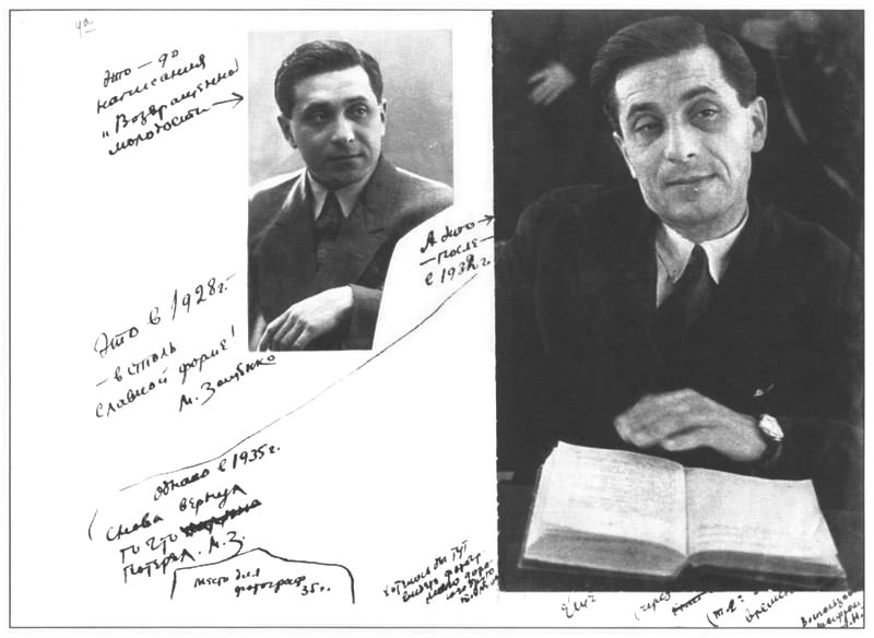 16. Подписи под фотографиями М. Зощенко слева направо (рукою М. Зощенко): Это — до написания «Возвращенной молодости». Это в 1928 г. — в столь славной форме. М. Зощенко. А это — после — в 1932 г. Однако в 1935 г. снова вернул то <,> что потерял. М. З. Место для фотограф<ии> 35 г. Хотелось бы тут видеть моего дорогого друга Ю. Олешу. Еще (через (м.2: времени) воспользовался шифром Л. Н. Толстого. (рукою Ю. Олеши): Мой дорогой друг Миша Зощенко. Ю. Олеша.