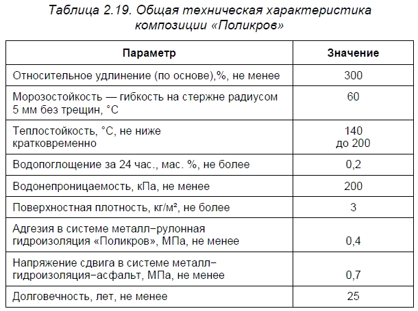 Высокая атмосферостойкость гидроизоляции «Поликров» позволяет использовать его также для временной (до 5 лет) консервации недостроенных объектов без дополнительных затрат. Основые характеристики гидроизоляции «Поликров» даны в табл. 2.19.