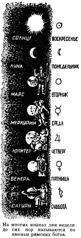 Воскресенье у немцев и англичан называется днем Солнца, а у французов, испанцев и португальцев — днем бога, у многих народов понедельник — день Луны, вторник — Марса, среда — Меркурия, четверг — громовержца Юпитера (у немцев — день грома), пятница — Венеры, суббота — Сатурна.