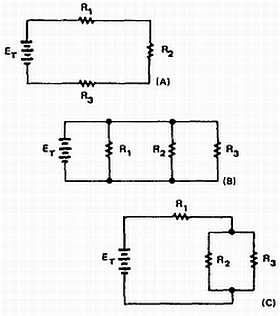Рис. 4-17. Три типа резистивных цепей: (А) последовательная цепь, (В) параллельная цепь, (С) последовательно-параллельная цепь.