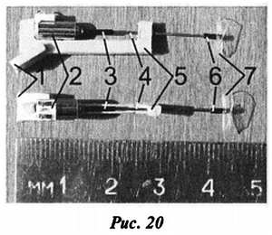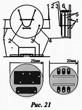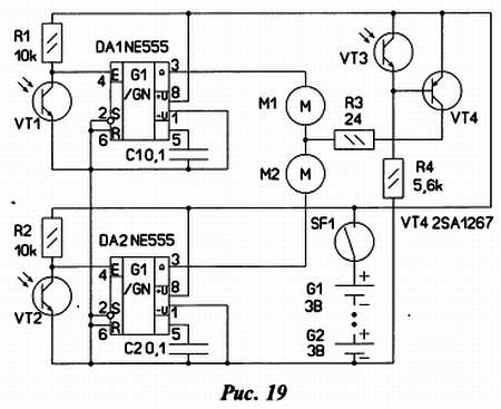 Применены постоянные резисторы МЛТ, С2-23, конденсаторы — К10-17 В. Транзистор 2SA1267 можно заменить любым из серии КТ3107, фототранзисторы взяты от привода принтера «Роботрон», но подойдут и КТФ102А. Геркон — любой малогабаритный, его включают с помощью малогабаритного магнита от лазерной головки DVD-проигрывателя. Изготовление устройства удобнее начать с изготовления двигателей (рис. 20).