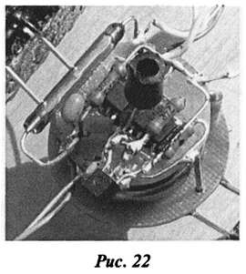 Применены таймеры в корпусах для поверхностного монтажа, их выводы вставляют в пазы и приклеивают к плате. Монтаж проводят с помощью тонкого (0,15…0,3 мм) лужёного провода. На шесть фольгированных площадок с отверстиями выводят питание, выходы и входы Е таймеров. Сверху (рис. 22) навесным монтажом крепят резисторы, конденсаторы, транзистор, фототранзистор VT3 и геркон.